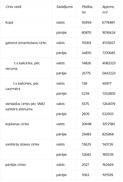 Kopējā cirsmu platība sastāda 137 865 hektārus, savukārt meža īpašnieku plānotais izcērtamās koksnes likvīdais apjoms iesniegumos norādīts 15,795 miljoni m3.