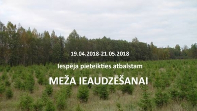 No 19. aprīļa līdz 21. maijam varēs iesniegt projekta pieteikumu Lauku atbalsta dienestā aktivitātes "Ieguldījumi meža platību paplašināšanā un mežu dzīvotspējas uzlabošanā" Atbalsta pasākumā "Meža ieaudzēšana". Šajā aktivitātē īstenojamie pasākumi ir meža ieaudzēšana un kopšana un ieaugušas mežaudzes papildināšana un kopšana.