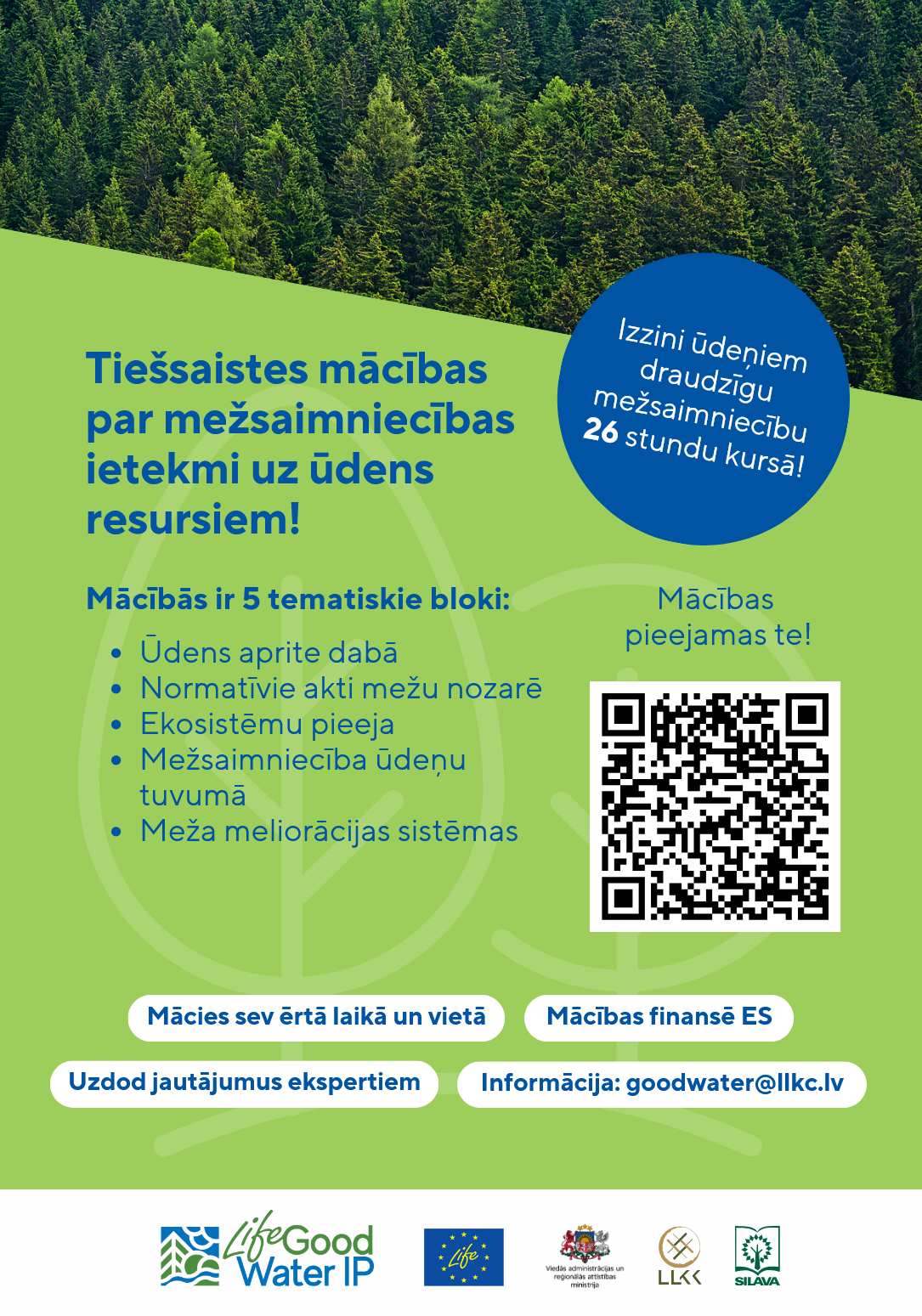- Mežsaimniecības ietekme uz ūdens kvalitāti – 4 lekciju tēmas par labu praksi meža apsaimniekošanā ūdensobjektu tuvumā (zaļās infrastruktūras risinājumiem), ūdens nozīmi meža ieaudzēšanā, atjaunošanā un kopšanā;