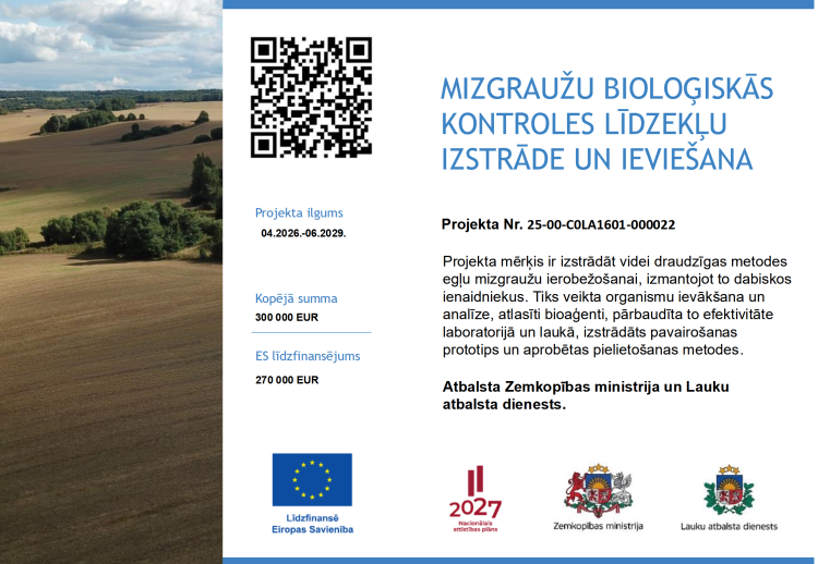 Projekts "Mizgraužu bioloģiskās kontroles līdzekļu izstrāde un ieviešana" (Nr. 25-00-C0LA160-000022) tiek īstenots Eiropas Lauksaimniecības fonda lauku attīstībai Latvijas Lauku attīstības plāna 2023. – 2027. gadam pasākuma “Atbalsts Eiropas Inovāciju partnerības darba grupu projekta īstenošanai" ietvaros.