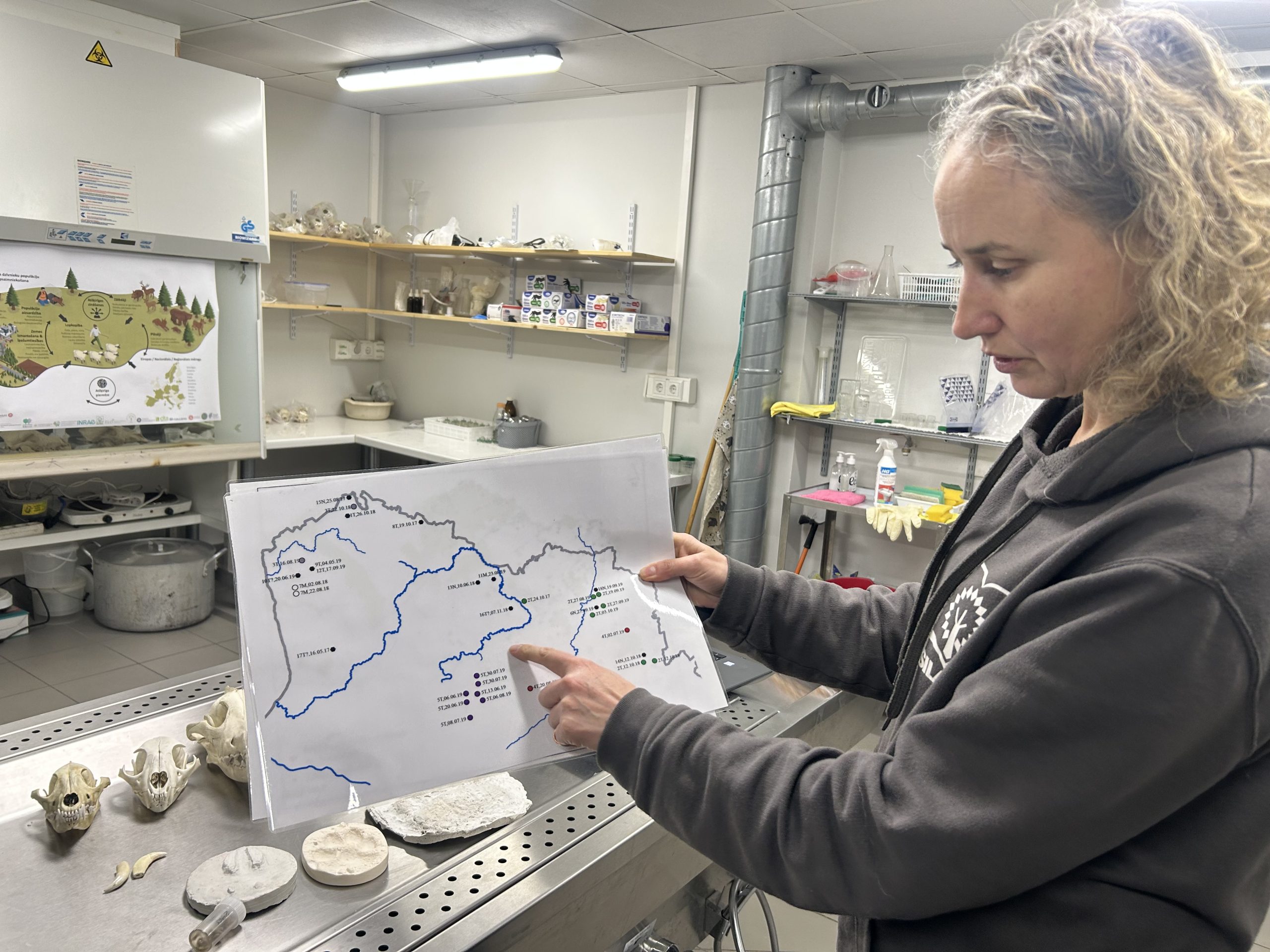 “Te ir tāda riktīga lāču grupiņa atnākusi. Un, lūk, re kur ir, lienot pa apakšu, dzeloņdrātī ieķeras matu gabaliņš,” stāsta Guna Bagrade, Latvijas Valsts mežzinātnes institūta “Silava” vadošā pētniece.