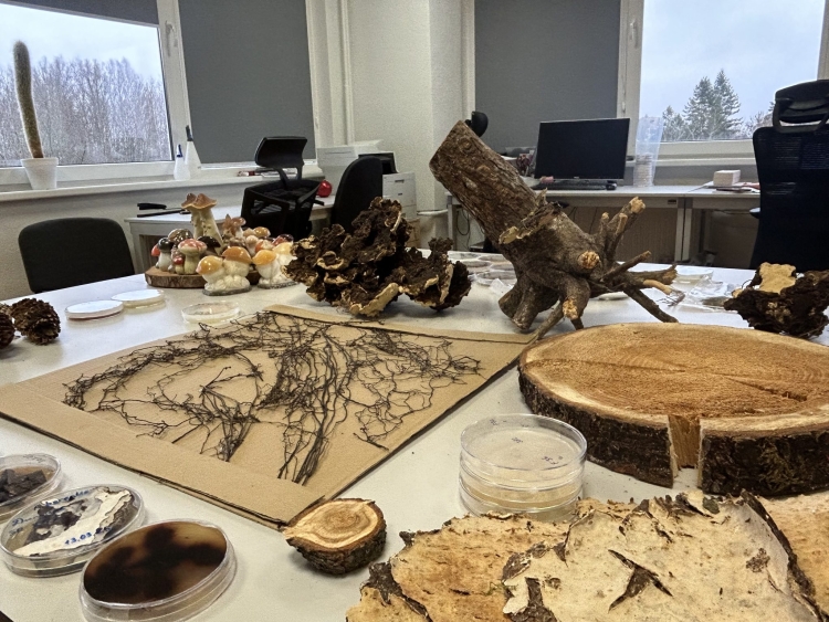 Uz balta galda izvietoti meža pētījumu paraugi: koka stumbra šķērsgriezumi, sēnes, sakņu tīkls un mizas.