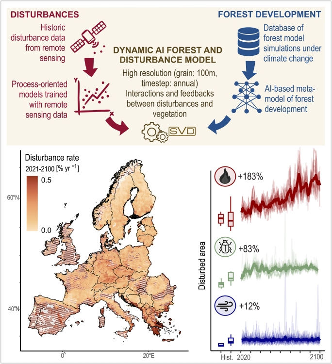 Šajā pētījumā mēs piedāvājam modelēšanas ietvaru, lai simulētu mežu traucējumu nākotnes attīstības trajektorijas augstā telpiskā izšķirtspējā (100 × 100 metri) un ļoti plašā teritorijā (187 miljoni hektāru mežu Eiropā). Mēs izmantojām dziļās mācīšanās simulācijas ietvaru, lai apvienotu plašu lokālo prognožu kopumu no procesiem balstītiem meža modeļiem ar klimatjutīgiem traucējumu moduļiem meža ugunsgrēkiem, vējgāzēm un mizgraužu uzliesmojumiem. Mūsu modelēšanas ietvars ir izstrādāts tā, lai atspoguļotu būtiskus traucējumu procesus, piemēram, ugunsgrēku un mizgraužu telpisko izplatīšanos meža ainavās, kā arī ietver traucējumu savstarpējās mijiedarbības un veģetācijas atgriezeniskās saites. Mūsu konkrētie mērķi bija kvantitatīvi novērtēt iespējamās mežaudzes pilnībā nomainošo traucējumu izmaiņas Eiropā līdz 21. gadsimta beigām dažādos klimata pārmaiņu scenārijos un izvērtēt šo traucējumu izmaiņu ietekmi uz Eiropas mežu demogrāfisko struktūru.