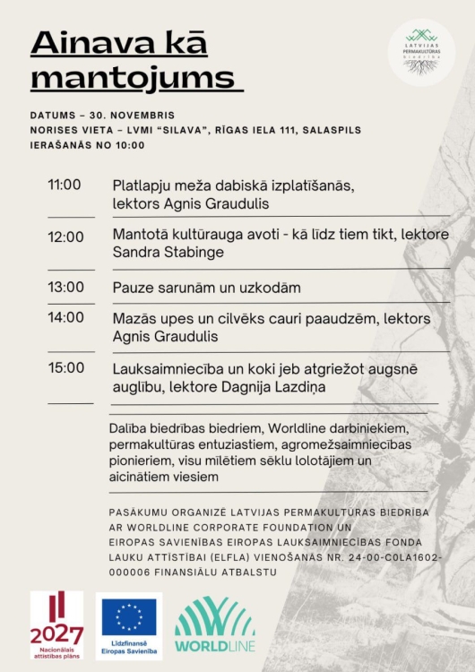 30. novembrī, svētdien, LVMI “Silava”, Rīgas ielā 111, Salaspilī, Latvijas permakultūras biedrība uz pasākumu “Ainava kā mantojums”, kurā eksperti dalīsies zināšanās par dabisko ekosistēmu attīstību, kultūraugu izcelsmi, mežu un lauksaimniecības mijiedarbību, kā arī ainavas vērtību nākotnes paaudzēs.