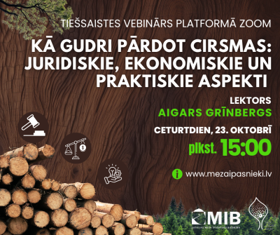 šŖµLatvijas Meža Ä«paÅ”nieku biedrÄ«ba organizÄs tieÅ”saistes vebinÄru meža Ä«paÅ”niekiem un citiem interesentiem tÄmÄ: "KÄ gudri pÄrdot cirsmas ā juridiskie, ekonomiskie un praktiskie aspekti", kur Aigars GrÄ«nbergs dalÄ«sies savÄ pieredzÄ un zinÄÅ”anÄs.
