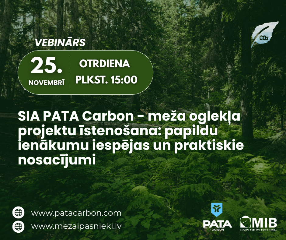 25. novembrī (otrdien), plkst. 15:00 aicinām piedalīties vebinārā, ko rīko SIA PATA Carbon, lai uzzinātu, kā iespējams gūt papildu ienākumus no sava meža, iesaistoties oglekļa projektos.